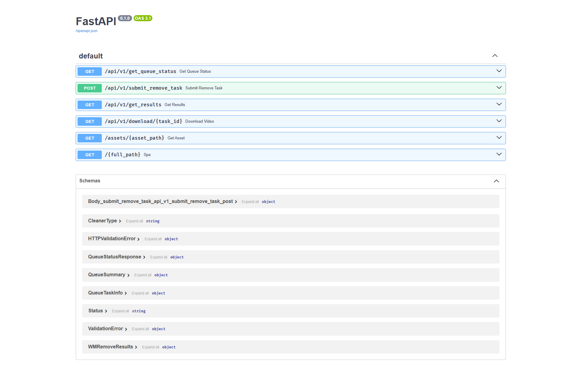 {"openapi":"3.1.0","info":{"title":"FastAPI","version":"0.1.0"},"paths":{"/api/v1/get_queue_status":{"get":{"summary":"Get Queue Status","operationId":"get_queue_status_api_v1_get_queue_status_get","responses":{"200":{"description":"Successful Response","content":{"application/json":{"schema":{"$ref":"#/components/schemas/QueueStatusResponse"}}}}}}},"/api/v1/submit_remove_task":{"post":{"summary":"Submit Remove Task","operationId":"submit_remove_task_api_v1_submit_remove_task_post","parameters":[{"name":"cleaner_type","in":"query","required":false,"schema":{"$ref":"#/components/schemas/CleanerType","default":"lama"}}],"requestBody":{"required":true,"content":{"multipart/form-data":{"schema":{"$ref":"#/components/schemas/Body_submit_remove_task_api_v1_submit_remove_task_post"}}}},"responses":{"200":{"description":"Successful Response","content":{"application/json":{"schema":{}}}},"422":{"description":"Validation Error","content":{"application/json":{"schema":{"$ref":"#/components/schemas/HTTPValidationError"}}}}}}},"/api/v1/get_results":{"get":{"summary":"Get Results","operationId":"get_results_api_v1_get_results_get","parameters":[{"name":"remove_task_id","in":"query","required":true,"schema":{"type":"string","title":"Remove Task Id"}}],"responses":{"200":{"description":"Successful Response","content":{"application/json":{"schema":{"$ref":"#/components/schemas/WMRemoveResults"}}}},"422":{"description":"Validation Error","content":{"application/json":{"schema":{"$ref":"#/components/schemas/HTTPValidationError"}}}}}}},"/api/v1/download/{task_id}":{"get":{"summary":"Download Video","operationId":"download_video_api_v1_download__task_id__get","parameters":[{"name":"task_id","in":"path","required":true,"schema":{"type":"string","title":"Task Id"}}],"responses":{"200":{"description":"Successful Response","content":{"application/json":{"schema":{}}}},"422":{"description":"Validation Error","content":{"application/json":{"schema":{"$ref":"#/components/schemas/HTTPValidationError"}}}}}}},"/assets/{asset_path}":{"get":{"summary":"Get Asset","operationId":"get_asset_assets__asset_path__get","parameters":[{"name":"asset_path","in":"path","required":true,"schema":{"type":"string","title":"Asset Path"}}],"responses":{"200":{"description":"Successful Response","content":{"application/json":{"schema":{}}}},"422":{"description":"Validation Error","content":{"application/json":{"schema":{"$ref":"#/components/schemas/HTTPValidationError"}}}}}}},"/{full_path}":{"get":{"summary":"Spa","operationId":"spa__full_path__get","parameters":[{"name":"full_path","in":"path","required":true,"schema":{"type":"string","title":"Full Path"}}],"responses":{"200":{"description":"Successful Response","content":{"application/json":{"schema":{}}}},"422":{"description":"Validation Error","content":{"application/json":{"schema":{"$ref":"#/components/schemas/HTTPValidationError"}}}}}}}},"components":{"schemas":{"Body_submit_remove_task_api_v1_submit_remove_task_post":{"properties":{"video":{"type":"string","format":"binary","title":"Video"}},"type":"object","required":["video"],"title":"Body_submit_remove_task_api_v1_submit_remove_task_post"},"CleanerType":{"type":"string","enum":["lama","e2fgvi_hq"],"title":"CleanerType"},"HTTPValidationError":{"properties":{"detail":{"items":{"$ref":"#/components/schemas/ValidationError"},"type":"array","title":"Detail"}},"type":"object","title":"HTTPValidationError"},"QueueStatusResponse":{"properties":{"summary":{"$ref":"#/components/schemas/QueueSummary"},"current_task_id":{"anyOf":[{"type":"string"},{"type":"null"}],"title":"Current Task Id","description":"当前正在运行的任务ID"},"waiting_queue":{"items":{"$ref":"#/components/schemas/QueueTaskInfo"},"type":"array","title":"Waiting Queue","description":"排队中的任务列表"}},"type":"object","required":["summary"],"title":"QueueStatusResponse"},"QueueSummary":{"properties":{"is_busy":{"type":"boolean","title":"Is Busy","description":"当前是否正在处理任务"},"queue_length":{"type":"integer","title":"Queue Length","description":"当前排队等待的任务数量"},"total_active":{"type":"integer","title":"Total Active","description":"活跃任务总数 (进行中 + 排队中)"}},"type":"object","required":["is_busy","queue_length","total_active"],"title":"QueueSummary"},"QueueTaskInfo":{"properties":{"id":{"type":"string","title":"Id"},"status":{"type":"string","title":"Status"},"percentage":{"type":"integer","title":"Percentage"},"video_path":{"type":"string","title":"Video Path"},"created_at":{"anyOf":[{"type":"string","format":"date-time"},{"type":"null"}],"title":"Created At","description":"任务创建时间"}},"type":"object","required":["id","status","percentage","video_path"],"title":"QueueTaskInfo"},"Status":{"type":"string","enum":["UPLOADING","QUEUED","PROCESSING","FINISHED","ERROR"],"title":"Status"},"ValidationError":{"properties":{"loc":{"items":{"anyOf":[{"type":"string"},{"type":"integer"}]},"type":"array","title":"Location"},"msg":{"type":"string","title":"Message"},"type":{"type":"string","title":"Error Type"}},"type":"object","required":["loc","msg","type"],"title":"ValidationError"},"WMRemoveResults":{"properties":{"percentage":{"type":"integer","title":"Percentage"},"status":{"$ref":"#/components/schemas/Status"},"download_url":{"anyOf":[{"type":"string"},{"type":"null"}],"title":"Download Url"}},"type":"object","required":["percentage","status"],"title":"WMRemoveResults"}}}}