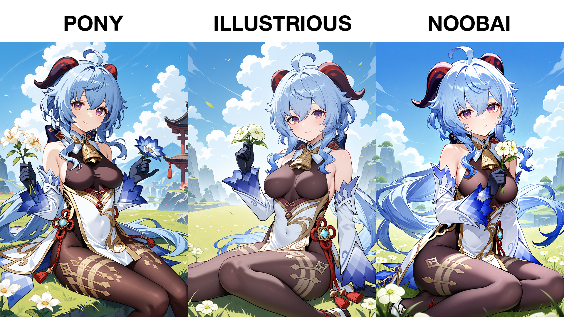 ตัวอย่างเปรียบเทียบระหว่าง Pony, Illustrious, NoobAI (ภาพจาก text-to-image ล้วนๆ prompt เหมือนกันยกเว้น prompt คุณภาพ)