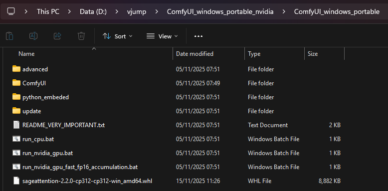 - จากนั้นโหลดไฟล์ SageAttenion มาแล้ววางไว้ที่ folder comfyui portable นอกสุด