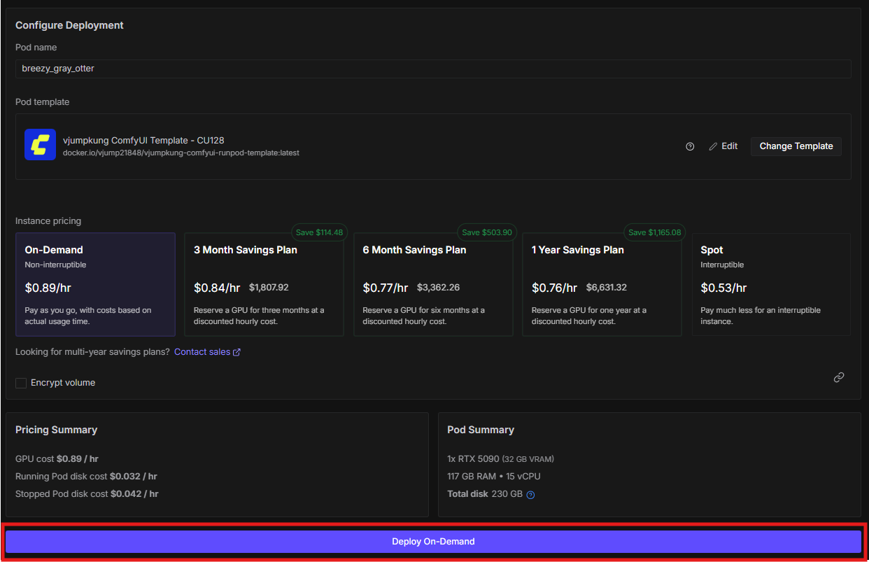 แนะนำให้เลือก RTX 4090 ขึ้นไป หรือ RTX 5090 เพราะว่าราคาถูกและได้ประสิทธิภาพที่รวดเร็ว และ ให้เปลี่ยนจาก Security Cloud -> Community Cloud