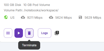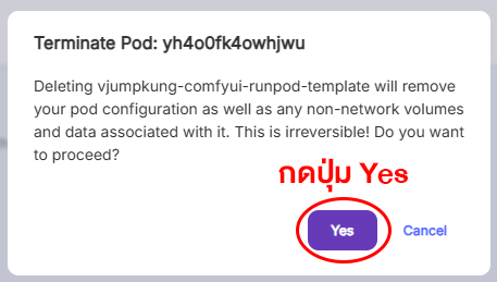 - เมื่อ stop แล้วให้ทำการ Terminate Pod เพื่อเป็นการหยุดเช่าการ์ดจอ