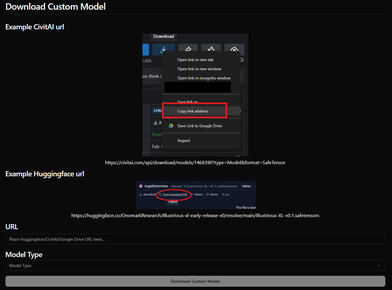 ช่อง Download Model จาก Google Drive, CivitAI หรือ Huggingface