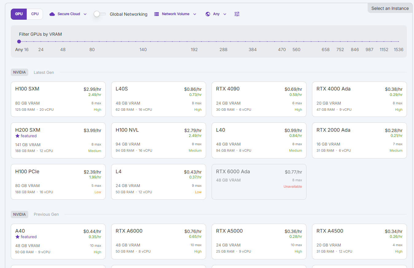 เมื่อเข้ามายัง link template url จะมีให้เลือกการ์ดจอให้ใช้งาน ปกติจะเลือก RTX 4090 (ได้ถึง Flux FP8, WAI2.1 FP8, HunyuanI2V FP8), A40, L40 สำหรับ (Flux FP16, WAI2.1 FP16, HunyuanI2V FP16)