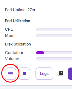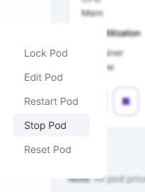 - เมื่อใช้งานเสร็จแล้วให้มาที่ Pod ทั้งหมดที่ Deploy และกดปุ่ม hamburger menu แล้วกด Stop Pod จะมีเตือนเรื่องค่า Storage แล้วให้กด Stop Pod อีกรอบ